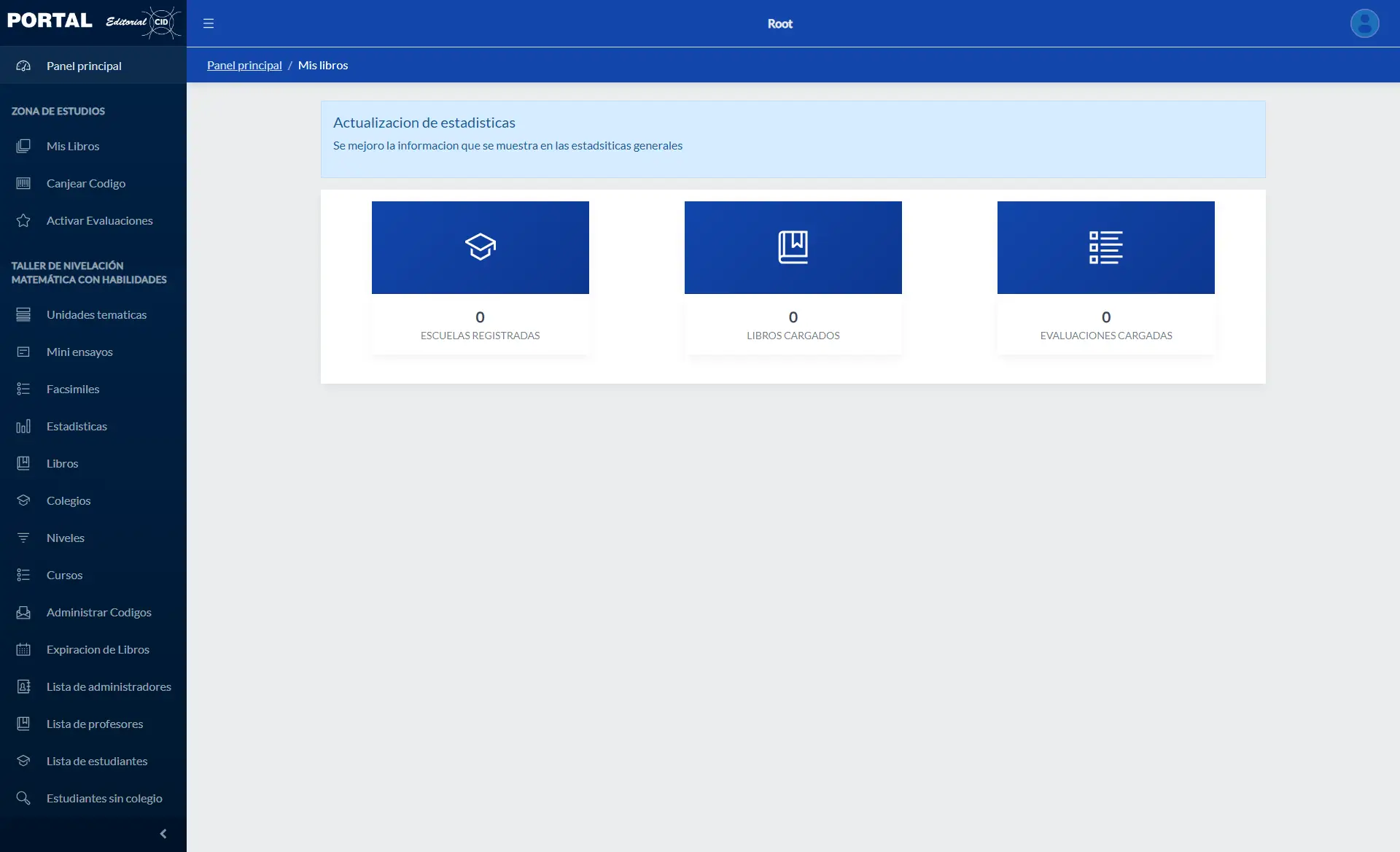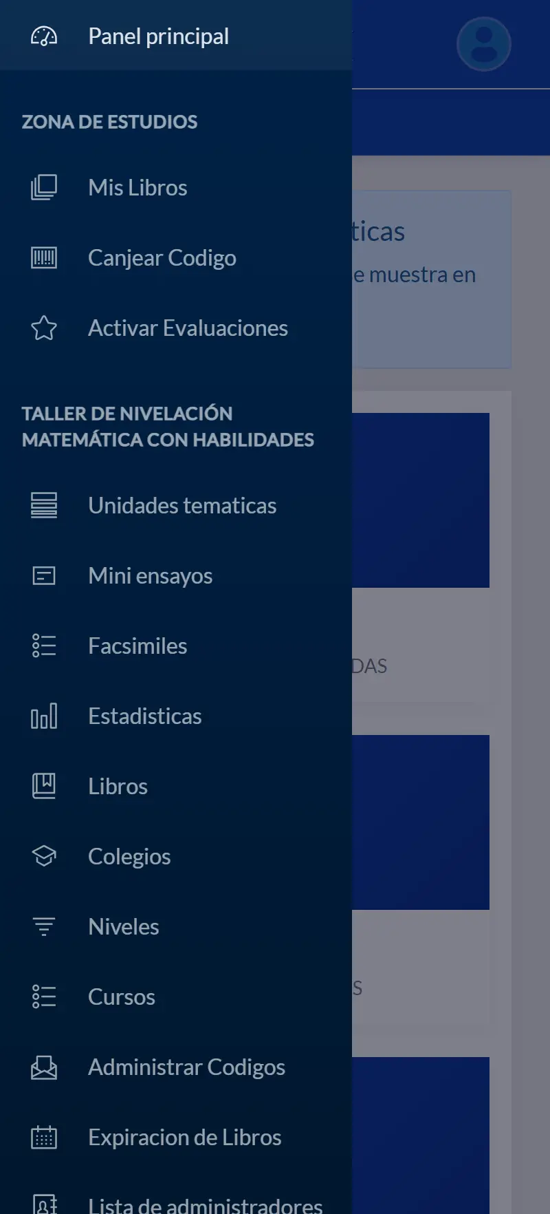 Sistema administrativo para visualizar libros en formato digital y realizar ensayos y facsímiles de prueba sobre las temáticas de los libros. La plataforma incluye gestión de cursos para colegios y seguimiento de estadísticas de los estudiantes.